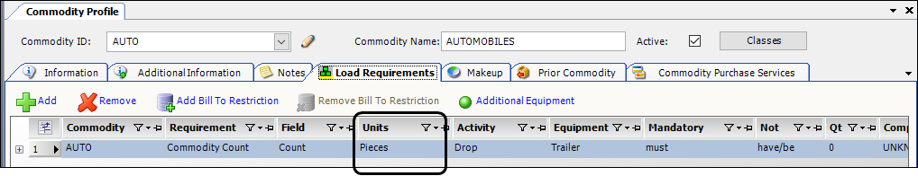 Note: This applies only to commodity count or commodity weight load requirements. Commodity size load requirements do not use a unit of measure.
