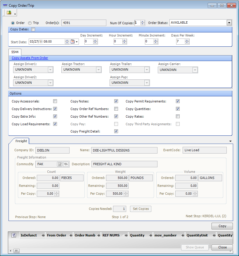 Note: Scrolling through multiple copies and access the Copied Orders Que window are not available from the Trip Folder.