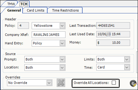 If the card is already in override mode, the Override All Locations checkbox is unavailable and you cannot make changes to TCH data. A message appears in the field below the Payroll section: "The currently selected card is in override mode. Please remove the current override before making any changes."