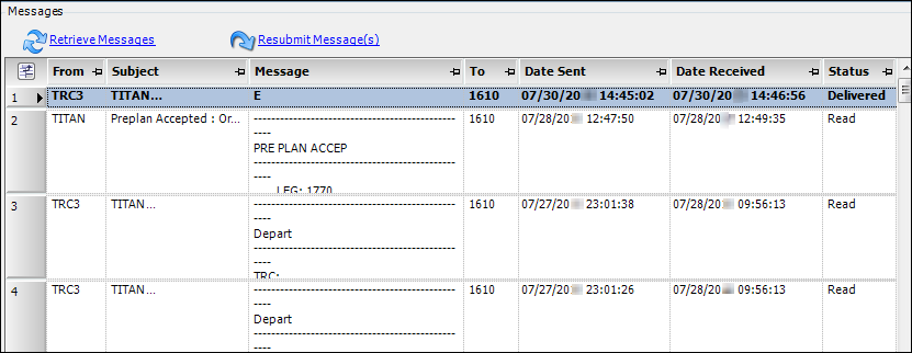 Once you have retrieved messages, they appear in the Message grid. It displays two types of messages: