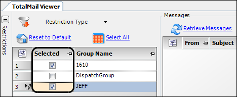 | To undo any restrictions you have set, click Reset to Default. The dispatch groups you belong to are selected. Messages for those groups will be retrieved. |