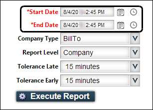 This example shows the report’s restrictions in date fields, with the Start Date and End Date required.