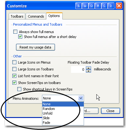 Use this procedure to change the menu animation, or the way in which the menu commands are presented when selecting a menu category.