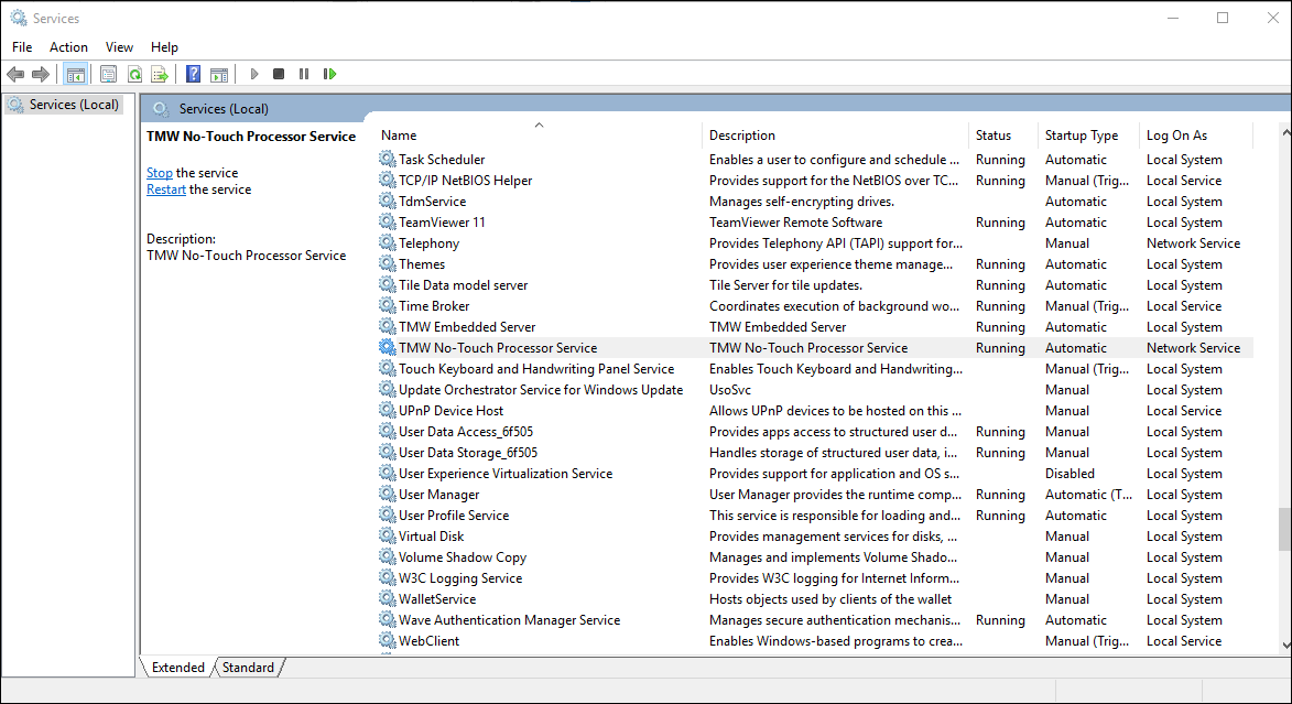 Note: The service name for the No-Touch Processor is TMWNTProcessor.