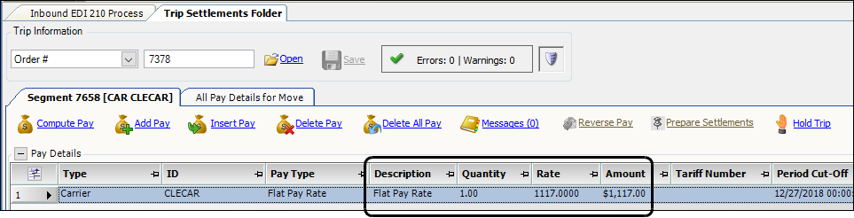 A flat pay detail is created in Settlements based on the amount recorded in the invoice header’s Total Charge column.