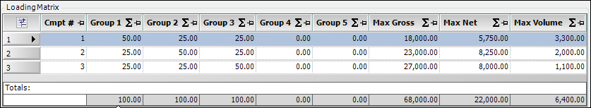 In the Loading Matrix grid’s Group 1-5 columns, enter the percentage of each axle group’s weight capacity that is dedicated to supporting each compartment.