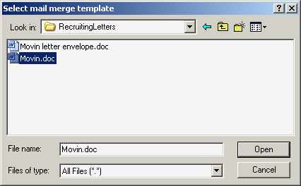 In the Select mail merge template dialog box displays, browse to the appropriate folder and highlight the required Word file.