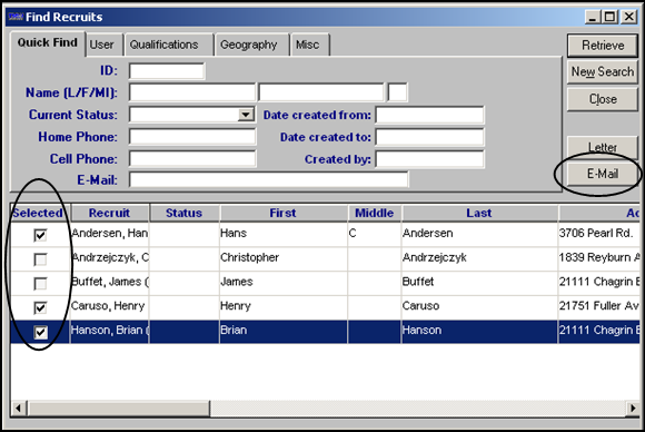 In the Selected column of the retrieval list, select the check box for each recruit you want to send correspondence.