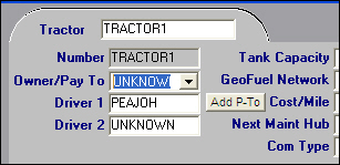 If the Actg Type for this tractor is Accts Payable, one of these buttons will display just opposite Driver 1 as shown below. Use the button to access the Pay To File Maintenance window in order to add a new profile or edit current Pay To information. (The buttons can be hidden if you decide not to use this feature.)