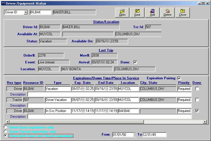 The Expiration Pairing feature serves as a crosscheck of availability for a driver and tractor that have been linked in their individual resource profiles. In the example shown here, the driver, Bill Baker, is associated with the specific tractor having an ID of 507.