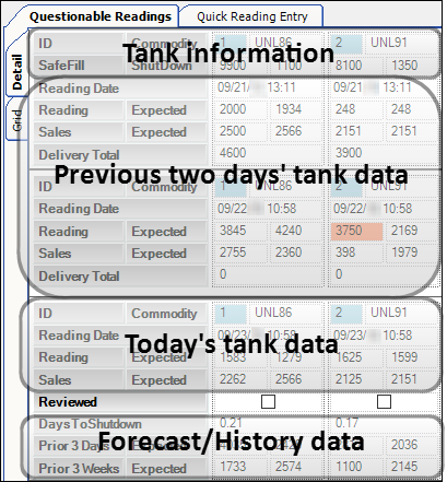 The Questionable Readings/Grid tab shows readings history for a store’s tanks.