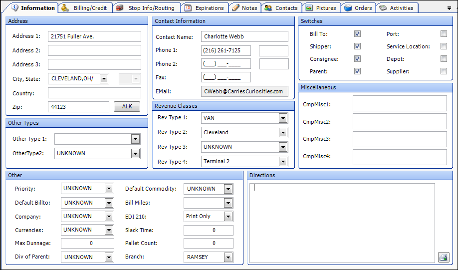 • Company type, i.e., Bill To, shipper, etc.