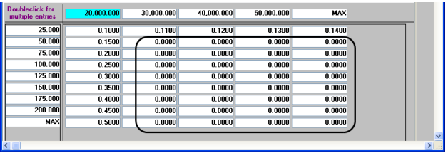 When a table is defined by both rows and columns, extra steps are required to generate rates in all cells. This is true because when you use the Add Table Rows window (or the Add Table Columns window), the system generates the row (or column) lookup values in the header column (or row), and the corresponding rates in first column (or row). For example: