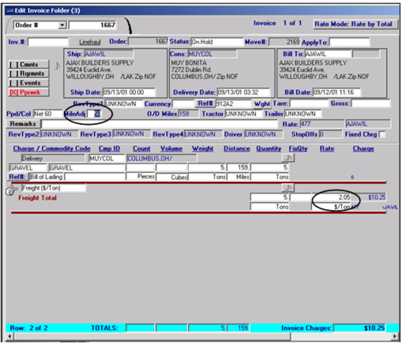 The system will adjust the mileage, based on your entry in the MileAdj field, before calculating the line haul charge.