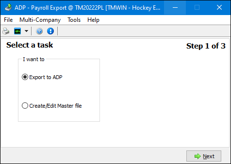 The first screen you will see upon opening the program is the 'Select a task' form. Here you will choose between a simple 'Export to ADP' or the option to 'Create/Edit Master file'. Select one of the available options and click the 'Next' button near the bottom of the window.