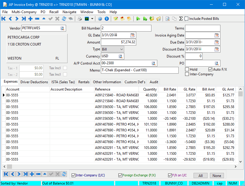 Note: If the Auto F/X checkbox is selected, differences between the two rates are added as a read-only foreign exchange expense detail to the foreign exchange expense account (to make the GL balance). |