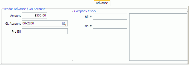 The Advance Tab can be used to issue and advance cheque to a vendor.