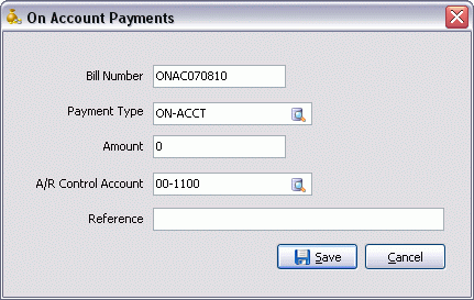 Note: You can enter multiple 'On Account' transactions for a specific payment on the same day, the system will generate a letter sequence for each transaction ('Bill Number') on a specific day. For example suppose that multiple transactions took place on September 13, 2011, first transaction could have 'QA110913A' as the Bill Number so then the second would be 'QA110913B' and the next would be 'QA110913C' and so on and so forth for all 'On Account' transactions on the same day.