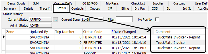 You can differentiate between a print and a reprint by specifying 'Truckmate Invoicer' for prints, and 'Truckmate Invoicer Reprint' for reprints. This appears in the Comment column of the "FB PRINTED" ODRSTAT records.