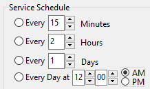 This section consists of the timing options available for scheduling this service. The first three radio buttons are used to set an interval between each run of the service and the next. The interval can be set in Minutes, Hours or Days based on your selection.