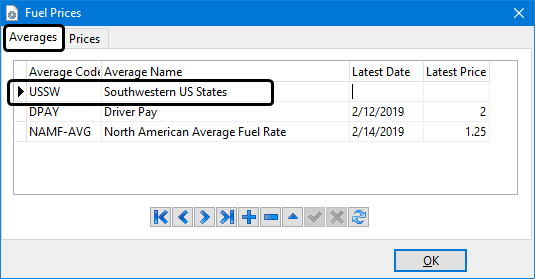 Average Codes are used to determine Fuel Surcharges for the 'Current Fuel Price' and 'FSC (DOE Average)' Charge Behaviors. Once defined on this tab, entries in the Prices tab will set the current average price to be used for fuel surcharges.