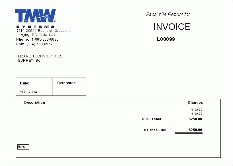 This report will produce a facsimile Invoice Reprint for the Freight Bill currently displayed in the Customer Service program, and shows the 'Date' the Invoice was created, and a breakdown of its charges.