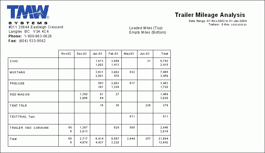 The report will generate a simple Table detailing the Mileage use of the Trailers in your system, with 'Loaded Miles' data displayed above 'Empty Miles' data.