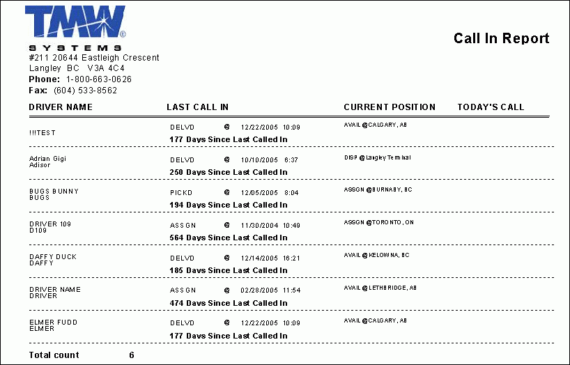 When this report is run, you will be prompted to enter in a list of Driver ID values, or simply to select the default value of '*' (all Drivers). The report will provide a list of Drivers, their 'Last Call In' date, their 'Current Position' and the details of 'Today’s Call' (if available).