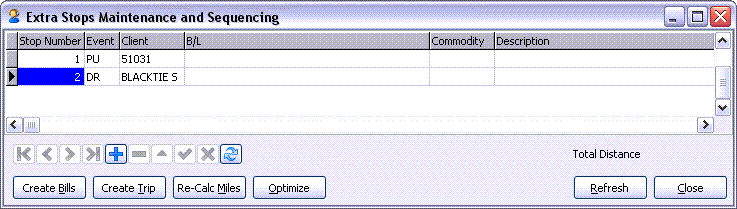 If your system allows, you can add stops to a freight bill using the Extra Stops Maintenance and Sequencing window.
