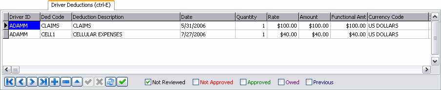Driver Deductions can be manually entered on this Tab. Note that you can only enter deductions for drivers who have an entry on the Pay Tab. The driver who is currently highlighted on the Pay Tab will by the default recipient of the deduction. This cannot be changed. All outstanding deduction entries for the driver highlighted on the Pay Tab will display in the grid. You can view deductions of all status types by selecting the checkboxes at the bottom of the Tab.
