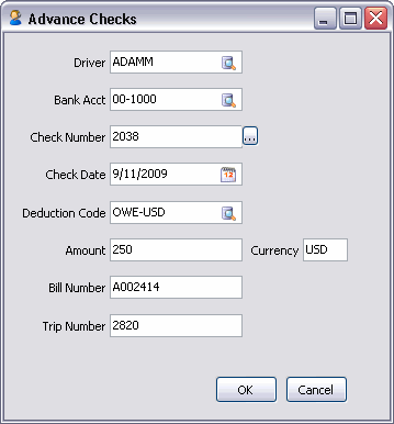Selecting this button will open the Advance Check window, whcih allows the user to create an advance check for any Drivers that have been assigned to the Freight Bill.