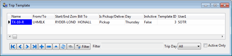 As with other master records in TruckMate, Template Trips can be flagged as 'Active' or 'Inactive'. This mechanism allows for master records which cannot be deleted but should not be used, to be hidden or disallowed for use from system processes. A Template Trip which represents a route which is in current use will be marked as an 'Active' record, and will therefore be available for use by Dispatch. A Template Trip representing a route which has become obsolete can be flagged as 'Inactive' so that it will not be visible to Dispatch nor available for use by users.