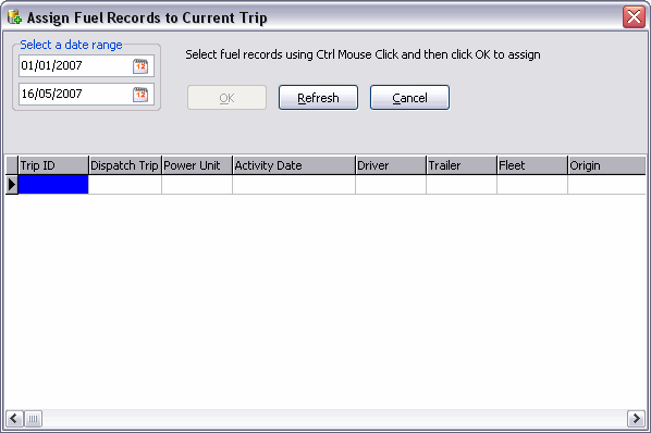Once some Fuel Records have been displayed within the Grid, you can '<Ctrl> click' to highlight a group of records. Clicking the 'Assign' button will then add those selected records to the main Fuel Purchase Tab’s grid. |