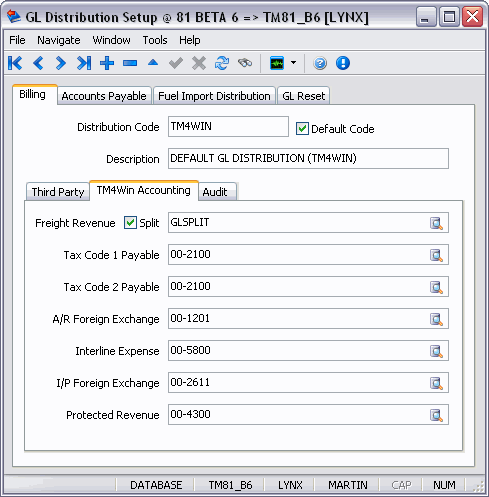 The Billing Tab allows users to configure distribution codes to be used for TruckMate accounting, or distribution codes to be used if the freight bill is exported to a 3rd party accounting system.