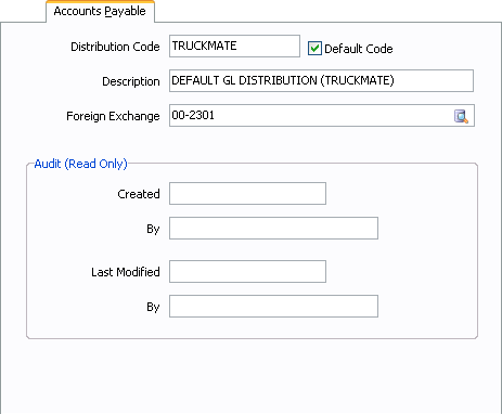 The Accounts Payable Tab refers only to TruckMate accounting; there is no export of Accounts Payable data to third party packages. The Foreign Exchange account specified on the Accounts Payable tab of GL Distribution is used by the A/P Invoice Entry program to automatically post foreign exchange amounts. For example, an invoice for $100.00 received from a US vendor might convert to $130.00 in Canadian funds, depending on the currency rate specified in the GL Chart of Accounts program. The Foreign Exchange account specified will determine which account is credited with the $30.00 exchange amount when the invoice is posted (the expense account selected would be debited $130.00, while the US control account is credited $100.00)