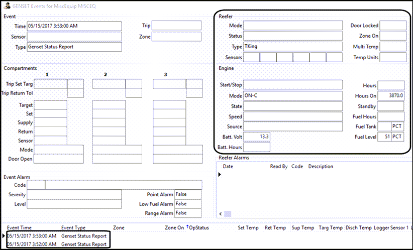 Opens the Genset Events for MiscEquip <x> window to display any historical reefer events and alarms associated with this equipment item. |