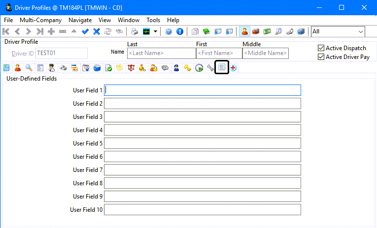 In the R&M tab of the Driver Profiles program, you can access ten free format fields by using the <CTRL><U> key combination. The field labels for those fields are edited here. Enter the field label text as you want it to appear on the User Defined Fields form in the R&M tab. |