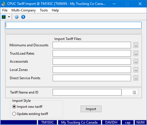 In TruckMate 2022.x and earlier: TruckMate 20xx > CPUC Tariff Import |