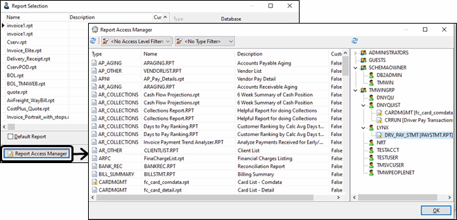 The TruckMate Report Selection window provides the Report Access Manager window to set report restrictions for TruckMate users.