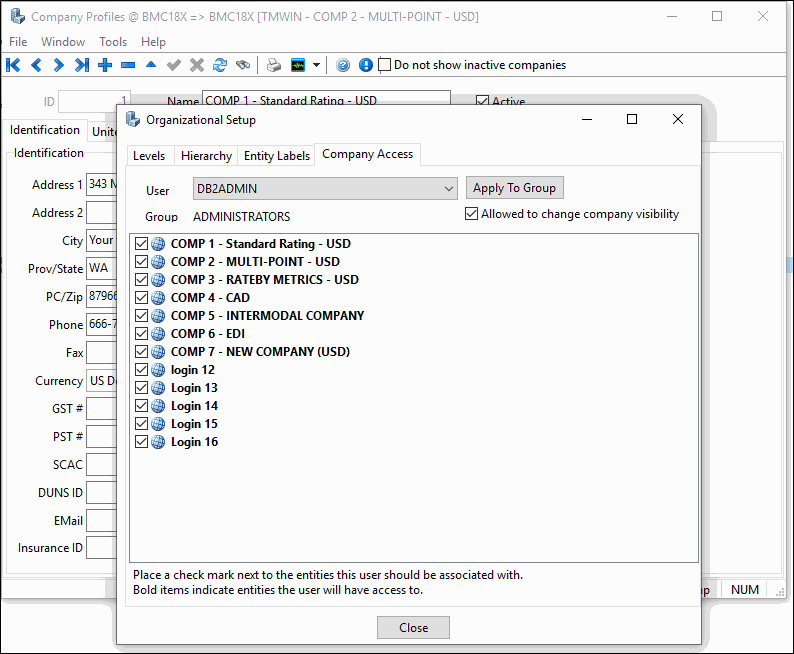 | Never use DB2ADMIN or any schema owner when trying to use TruckMate in a multi-company environment. |