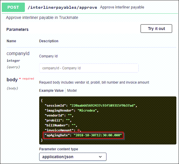 A new apAgingDate optional parameter has been added to the imaging REST API /interlinerpayables/approve endpoint to allow updates to the AP_AGING_DATE.