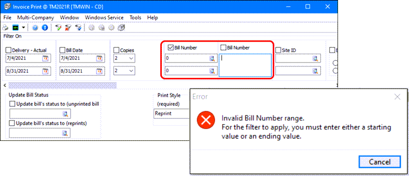 When enabling the "Bill number" or "Bill number" (Range) filter with the checkbox selected for either, and there are no bill numbers entered into either of the selections windows, an error message is displayed to prevent accidentally printing ALL outstanding bills.