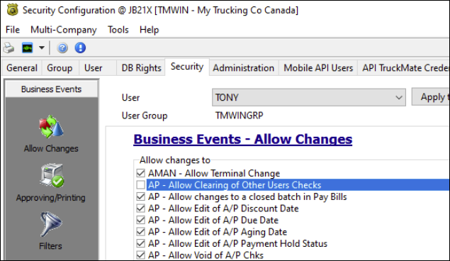 A new Allow Clearing of Other Users Checks security option was added to control whether you are allowed clearing of other users checks in both AP Inquiry and Check Printing.