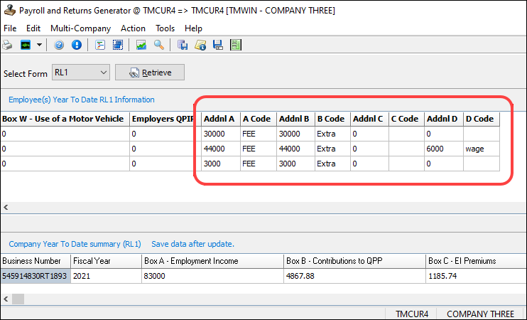 Six new columns have been added to the RL1 grid to hold the codes and amounts.