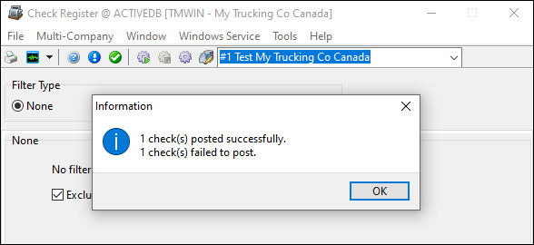 When the 'APNCR.EXE - Commit Each Trans' application configuration option is set to True and multiple checks are posted in Check Register. If there are 'bad' cheques but at least one good check is posted, a summary popup window will be displayed.