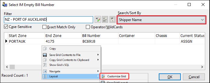 When displaying a trip with an intermodal bill in Dispatch and Multi Mode Dispatch, you access the Select IM Empty Bill Number window by selecting Intermodal > IM Swap Return Bills from the grid context menu.