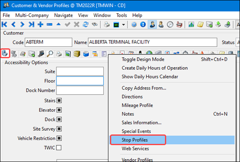 To access stop profiles, go to the Customer Profiles > Accessibility Options tab and select Stop Profiles from the context menu.