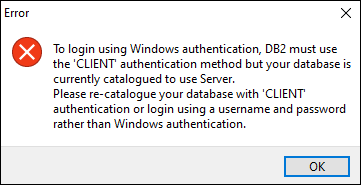 "To login using Windows Authentication, DB2 must use the 'CLIENT' authentication method but your database is currently catalogued to use Server. Please re-catalogue your database with 'CLIENT' authentication or login using a username and password rather than Windows Authentication."