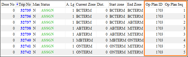 This column shows the sequence of Trip Operation Planning trips created and linked to a specific operational plan ID. With it, you can see the order of planned trips more clearly. You can also use grid formatting and filters to show or hide trips that are outside a Trip Operation Plan sequence.