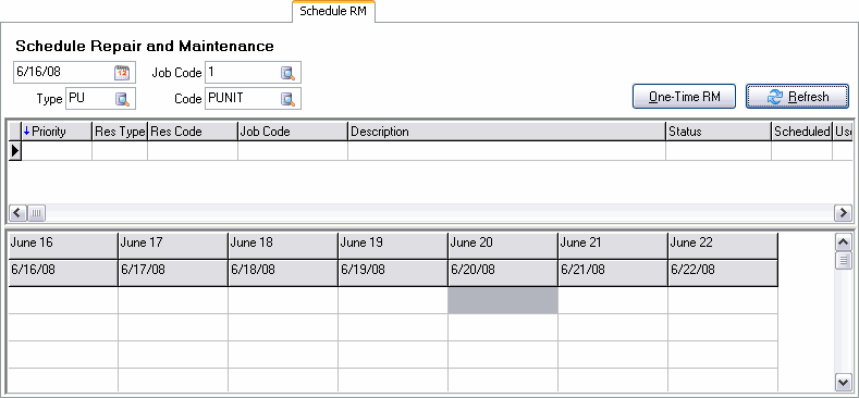 Scheduled maintenance jobs are defined on the Maintenance Tab. Job Codes are attached to units, and the interval at which the Job Codes should be executed is specified. Job Codes are defined in the R&M Configuration program. This is also a reference screen for viewing the maintenance history of your equipment.